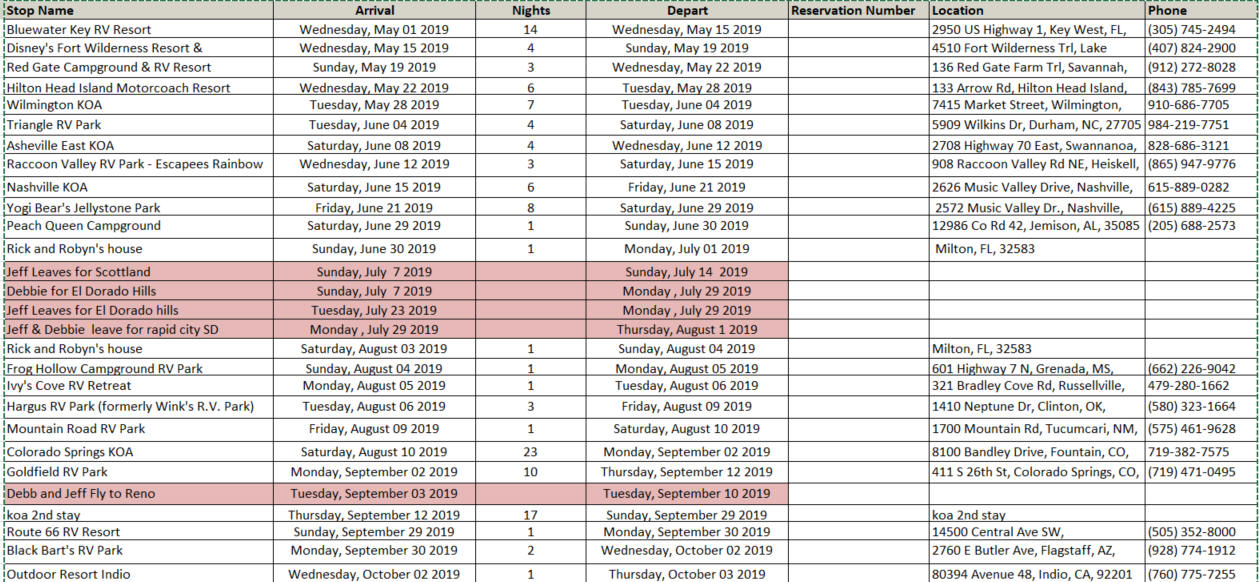 | Stop Name | Arrival | Nights | Depart | Reservation Number | Location | Phone |